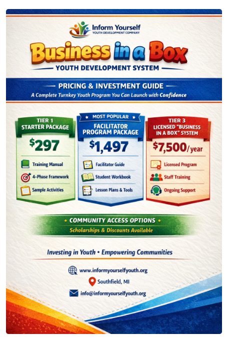 When you invest in Business in a Box, you are not just purchasing a program—you are joining a mission to empower youth, strengthen communities, and create pathways to success.