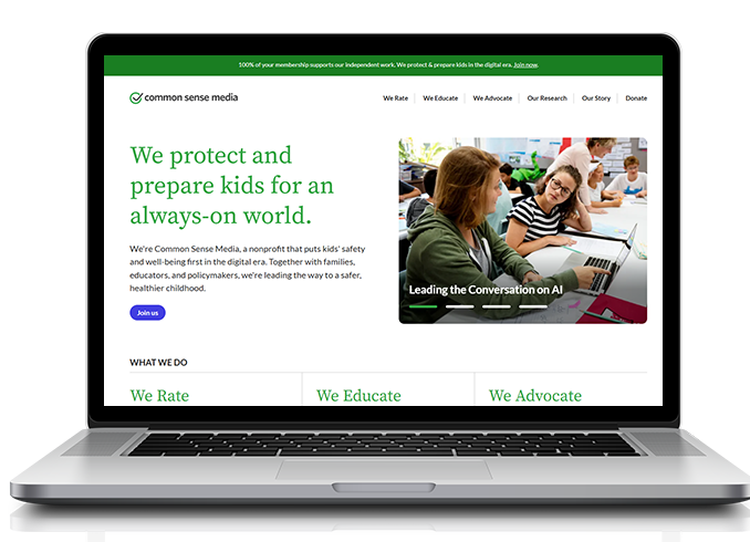 We're Common Sense Media, a nonprofit that puts kids' safety and well-being first in the digital era. Together with families, educators, and policymakers, we're leading the way to a safer, healthier childhood.